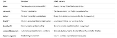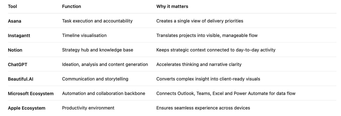 Everything is connected: a client project in Asana syncs with the strategy board in Notion; reporting templates are generated through ChatGPT; outputs are visualised in Beautiful.AI.